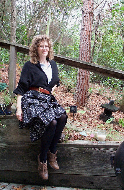 Tomorrow i'll set out my 'workaday capsule' (it's about 20 pieces). The outfit in this post i wore yesterday, drawing from the workaday capsule. The skunk skirt is a little on the fancy end, but it's cotton and a completely comfy piece. The color and pattern cancel out most staining worries. The top is a promotional polo from my mom's former workplace in size XL - too big for anyone i know! It comes down to my mid-thigh point without stretching. I've worn it a couple of times to see if i could pull it off with artful styling, but at this point i've decided to slice and dice it into some species of ruffled tee or tank. Like this - or maybe this? Either way, it stays in the 'workaday world'.